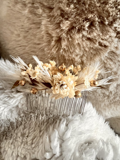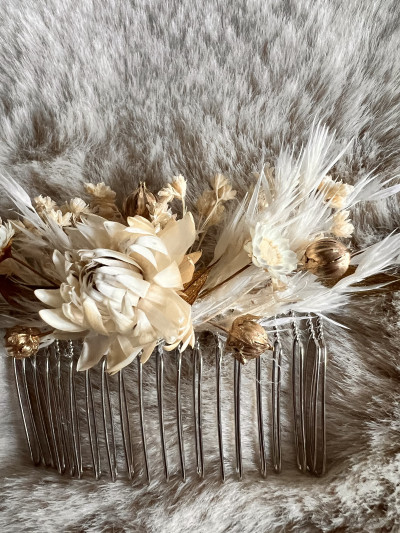 Dans cette magnifique peigne vous retrouverez une fleur de helichysum ivoire, du lin or, quelques fleurs de glixia et des brins de pampas blanches.