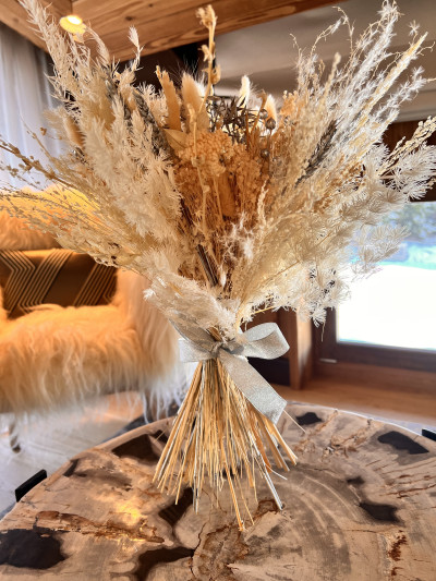 - Palme cup argenté, ming fern stabilisée blanc, lin argenté, blé argenté, achille blanc, lagurus crème, star grass crème, ruscus argenté, une pomme de pin pailletée, broom bloom crème, ruscus blanc et chœurs sec blanc.