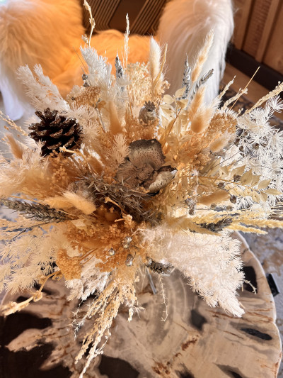 Fait main, vous trouverez dans ce bouquet une magnifique palme cup argenté, entouré de ming fern stabilisée blanc, accompagné du lin et du blé sec argenté, de l’achille blanc, du lagurus, du star grass crème, une touche de ruscus argenté et une pomme de pin pailletée pour donner une touche finale !