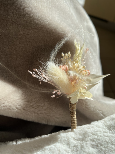 Dans cette élégante boutonnière vous retrouverez des pétales d’hortensia blanc, du lin rose, du broom bloom rose, du stipe plumeuse, du ruscus et du lagurus crème rose.
