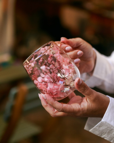 chaque tasse est fait enfin verre soufflé et remplie de fleurs séchées, disponibles en plusieurs couleurs.