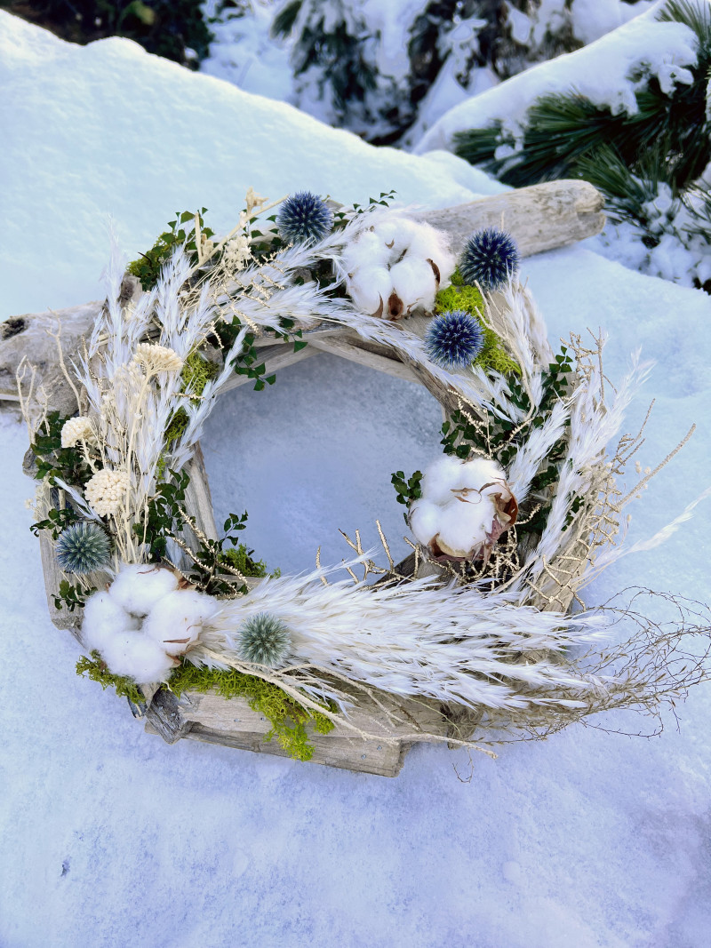 - Fleurs de coton, pampas, chardons bleus, fougère stabilisée verte et or, achilée blanc, branches de romarin sec crème, mousse des bois